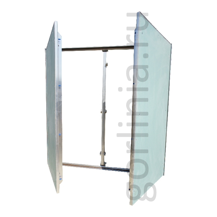 Нажимные створки ходят на несъемных петлях с одной осью вращения, дополнительно фиксируется в раме через съемную перемычку по центру