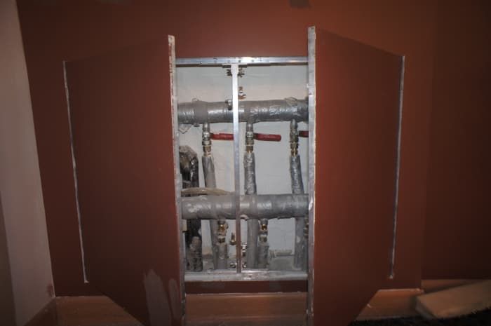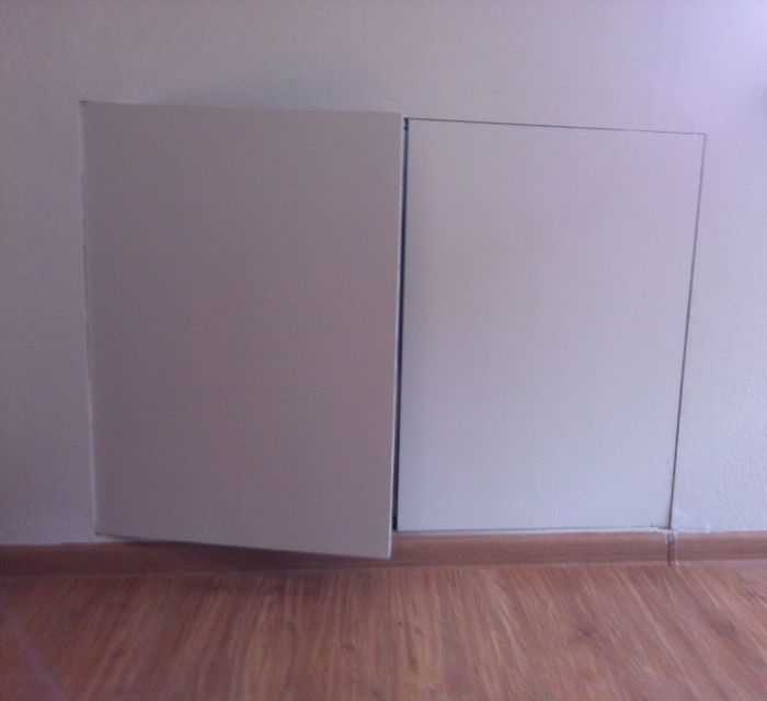 Нажимная дверца ходит на несъемных петлях с одной осью вращения, дополнительно фиксируется в коробке через съемную перемычку по центру. На больших створках в каркас закладываются элементы дополнительной обвязки.