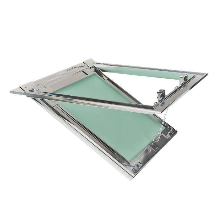 Нажимной люк под покраску Ультра в раме уголок от компании "Хаммер" со съемной панелью на страховочных тросах для крепления в потолки из однослойного гипсокартона без устройства каркаса из монтажных профилей согласно установочной схемы.