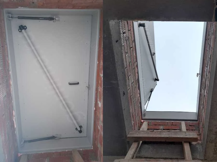 Подъемный механизм на шарнирах с газовыми пружинами для снятия нагрузки при подъеме крышки и плавного хода при опускании в створ. Система запирания на врезной замок с поворотными ригелями и двухсторонней личинкой. Снаружи опорно-укрывной элемент дополнительно закрывается на задвижку во время нахождения на кровле.