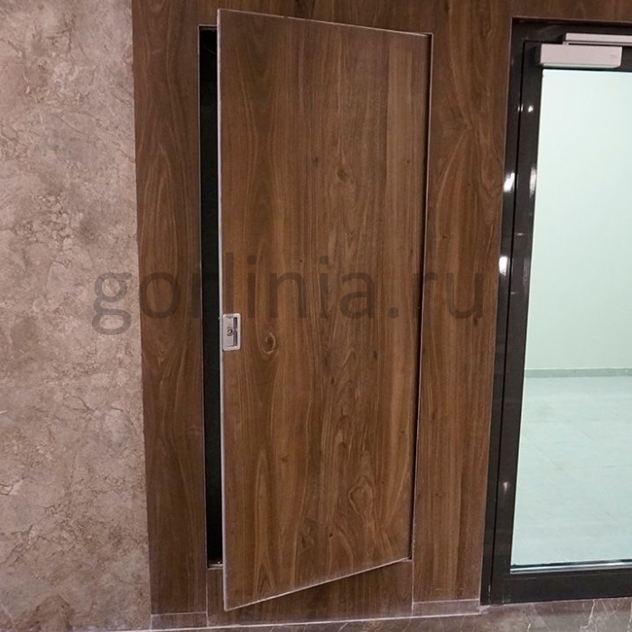 Скрытая коробка с порогом без наличника с терморасширяющейся лентой. Глухая распашная створка открывается на себя за ручку или нажатием, ходит на опорных подшипниках. Заполнена листами ГВЛ и огнеупорным ГСП-DF с прокладкой минваты ρ≥150 кг/м³. Предел огнестойкости 60 минут. Сертифицировано.